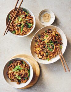 NOUILLES ASIATIQUES au PORC, CHAMPIGNONS et POIS MANGE-TOUT