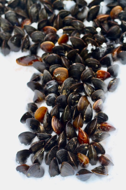 • Rest the first mussel against the nails (hinged side up) and place the remaining mussels in the shape of a cross or circle, each mussel resting on the others.